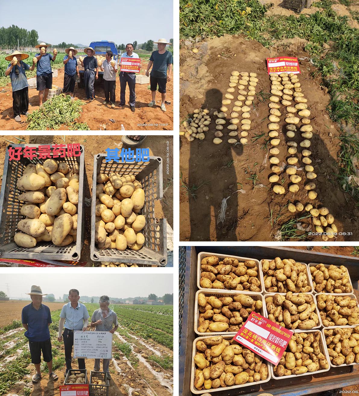 2022年6月19日,好年景藥肥廠家在山東沂南縣大王莊鄉(xiāng)泥泉官村(種植戶:王金貴),召開土豆現(xiàn)場測產(chǎn)觀摩會(huì),使用好年景藥肥示范田馬鈴薯成品果多,個(gè)頭大且非常均勻,品相好看,商品價(jià)值高,次品果少,對(duì)照田馬鈴薯個(gè)頭較小,大小不均勻,顏色發(fā)烏,小果偏多,經(jīng)過測算,使用好年景緩釋藥肥示范田每畝增產(chǎn)2281斤,增產(chǎn)增收效果顯著,種植戶對(duì)效果表現(xiàn)非常滿意,并表示今年玉米已經(jīng)全部使好年景藥肥,好年景藥肥省工、防效、提質(zhì)、增產(chǎn)。