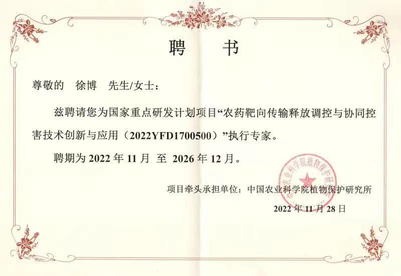 喜訊|好年景總經(jīng)理徐博被聘為國家重點研發(fā)計劃項目“農(nóng)藥靶向傳輸釋放調(diào)控與協(xié)同控害技術(shù)創(chuàng)新與應(yīng)用”執(zhí)行專家